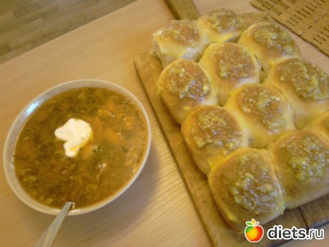 Пока пампушки расстаиваются-пекутся, займёмся чесночком: 4-5 зубчиков чеснока очистить, раздавить в чесночнице, посолить, добавить специи (кто. что любит), пару столовых ложек растительного масла, хорошенько растереть, если слишком густо - капнуть водички. Готовые румяные пампушки вынимаем из духовки и щедро намазываемя полученным чесночным соусом. Можно сделать в пампушках надрезы и в них затолкать соус.