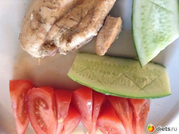 Вечером у меня дома была самая приличная еда - куриная грудка с помидором и огурцом:
