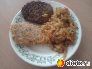 Ужин: Тушеная капуста, 1 оладушек кабачково-гречневый, котлетка из куриной грудки и риса.
