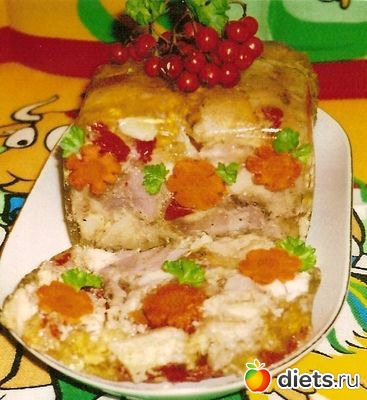 Как желе застынет, так сальтисон и готов. Подставьте коробку на секунду под струю горячей воды, разрежьте ее и извлеките сальтисон.