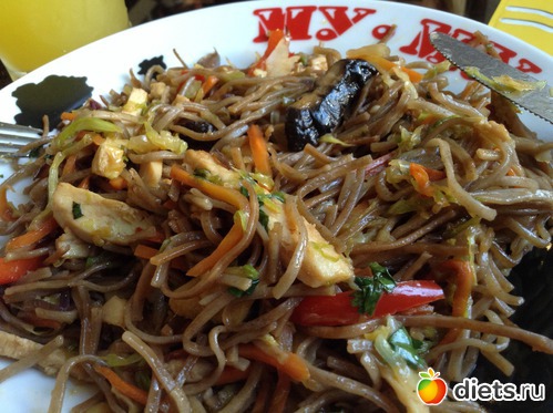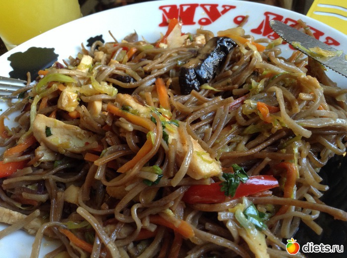 Чудо второе - большая порция гречневой лапши с курицей, грибами и овощами в Му-му, с цитрусовым нектаром, за 129 р.