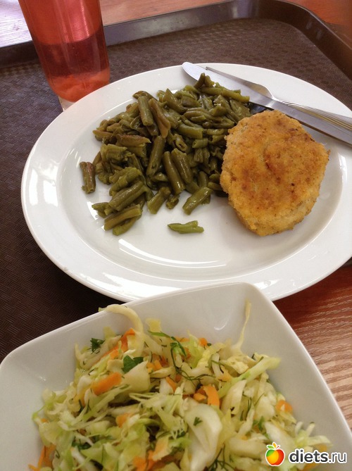 Чудо третье - больничный обед, на этот раз рыбная котлетка с тушеной фасолью, витаминный салат, компот, за 170 р.