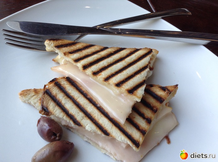Чудо первое - завтрак за 99 р. в Кофе-Хаузе, из вариантов (круассан, блинчики, лимонный кекс) выбрала самый невредный - тост с сыром и ветчиной к эспрессо-американо (завтраки дают до 12, так что у меня это был ланч).