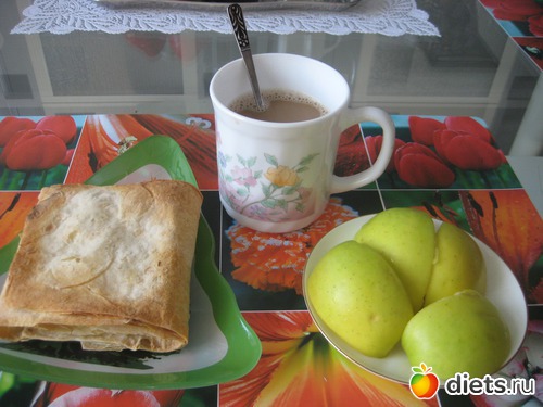 завтрак: лаваш с творогом, яблоком и корицей запеченый в духовке, кофе, остатки яблока)))