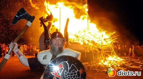 Шотландский праздник Апхелио. Жители города, в котором проходит торжество, строят модель древнего корабля с драконом на носу, наряжаются викингами и зажигают факелы. Далее, процессия проносит корабль через весь город к морю, трубя в традиционные военные горны. Более 900 живописно одетых участников следуют за дружиной из 40 викингов и их гигантским кораблем до места, где будет зажжен огонь. Вечером факельная процессия по старинному обряду погребения умерших воинов сжигает деревянную ладью викингов.