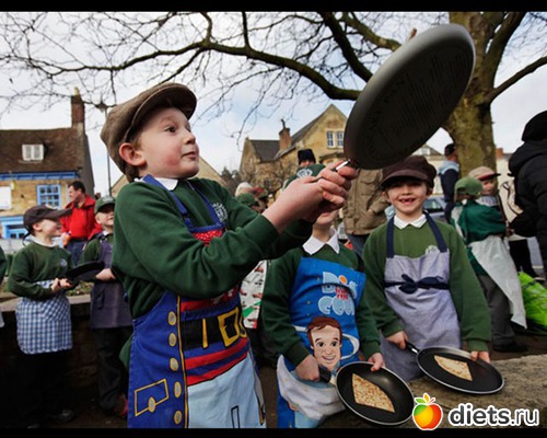 Началось с того, что как-то во время Великого поста одна из горожанок тайком жарила блинчики у себя на кухне. Внезапно раздался колокольный звон. Бедная хозяйка так перепугалась, что, забыв обо всем на свете, помчалась в церковь… прямо со сковородкой в руках и скворчащими на ней блинчиками. Это было в 1445 году. С тех пор горожане устраивают ежегодный забег с блинами – женщины, непременно в платьях и фартуках, должны пробежать определенную дистанцию, подбрасывая блин на сковородке. Подобная традиция существует и в Westminster School в Лондоне — блин, испеченный с конским волосом, чтобы он не развалился, подбрасывают на сковороде, а потом ученики стараются отхватить кусок побольше. Так что в Олби и Либерале женщины ежегодно бегают по улицам со сковородками в руках, на бегу переворачивая блинчики. А наградой победительнице служит поцелуй звонаря, почет и уважение. Ну, а блинчики, которые не упали со сковородок во время гонок, потом дружно поедаются зрителями.