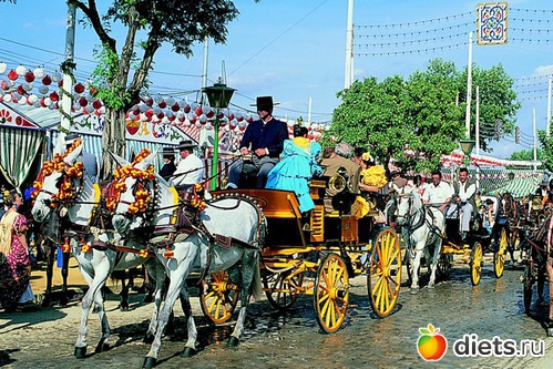 Знаменитая La Feria de Abril (апрельская ярмарка) открывается в Севилье сразу после Пасхи. На берегу Гвадалквивира ставят множество «касетас» — павильонов, украшенных зеркалами, свечами и бумажными фонариками. Там собираются люди в традиционных костюмах, поют, танцуют фламенко и традиционный танец этой местности – севилиану. С полудня до вечера почти все севильское общество фланирует вокруг ярмарки в экипажах или верхом. На улицах – иллюминация, песни и танцы под гитару, дегустация хереса и традиционных блюд разных областей Испании. Самое яркое зрелище ярмарки – бой быков на площади Маэстранца.