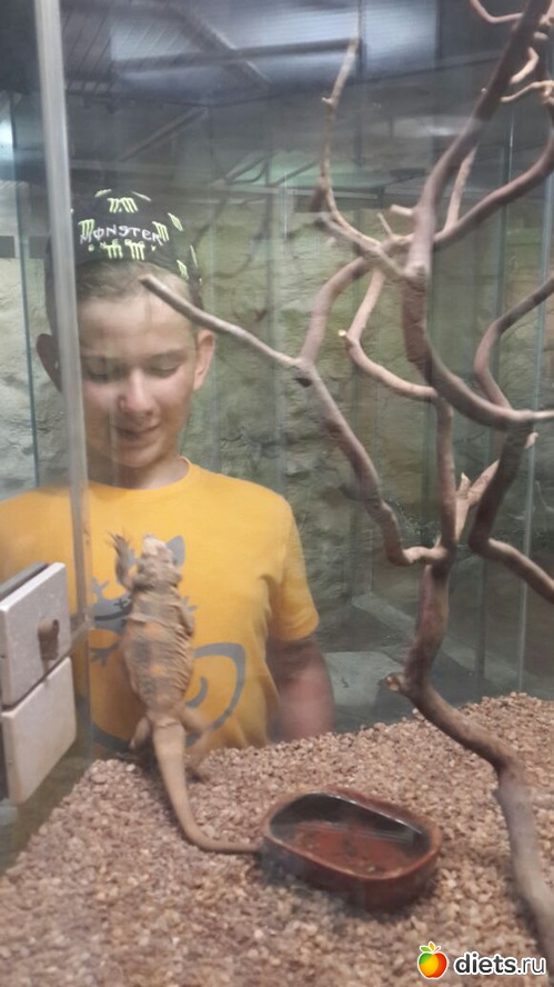 Не знаю, о чем подумала ящерица, когда Денис подошел к террариуму, но вела она себя очень активно. Видимо, завидев родственника, хотела познакомиться