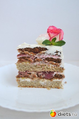 Каждый корж промазывала творожным кремом, а потом ягодным сиропом и так чередовала слои. Дала торту пропитаться в холодильнике(около 2х часов), после промазала верх и края остатками творожного крема и на ночь убрала в холодильник. Утром украсила свежими розами(для декора), кокосовой стружкой, кондитерской посыпкой, свежей мятой).