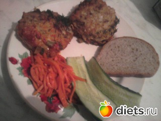 Ужин: огурец, морковь по - корейски, котлета рис+капуста+куриный фарш