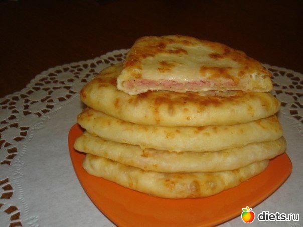 3. Полученное тесто разделить на колобки, раскатать небольшую лепешку (можно пожарить так), положить начинку (у меня - ветчина).