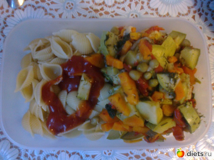 Обед: макарошки (мои любимые ракушки) с томатной пастой и тушеные овощи (кабачки, морковь, помидоры, зелень) капусты решила не добавлять)) Вот думаю, осилю ли я эту порцию