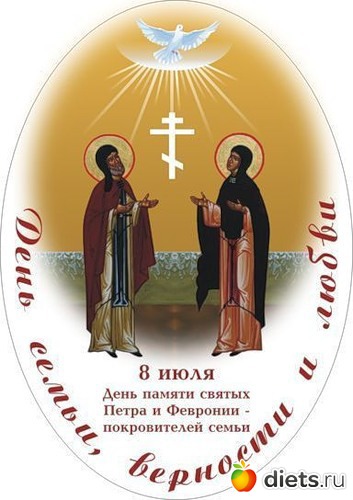 Петр и Феврония покровители всех семейных пар. Так случилось благодаря прекрасной легенде, которая рассказывает о безумной искренней любви двух людей, об их преданности и верности. Но самое примечательное в этой истории то, что эти благословенные Господом Богом сердца остановились в один день (25 июня 1228г., а по новому календарю – 8 июля). Супругов положили в разные могилы, но каким-то чудом они оказались в одном гробу. Теперь их мощи хранятся в Храме Святой Троицы в городе Муроме.