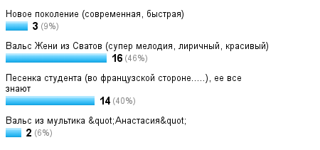 Юль, у Жени на щеке как будто след от пятерни, ее никто не укусил? Песни эти не слышала, кроме "Во французской стороны" Сейчас в ютубе послушала, хорошие песни все, но только вальс из Анастасии очень заунывная А Жене что больше нравится? Под Новое поколение можно и станцевать!