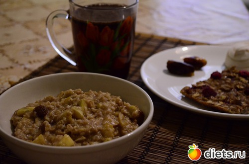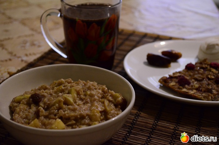 Овсянка с яблоками, изюмом, фруктозой и корицей. Пару фиников. Зефирка. Уже знакомый вам кусочек пирога(120 ккал на 100 г). Кофе.