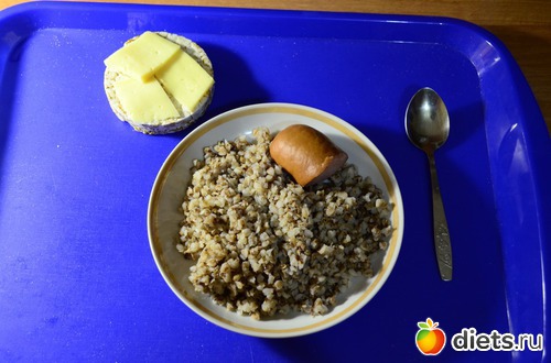Гречка с третью варёной сардельки. Хлебец с сыром.