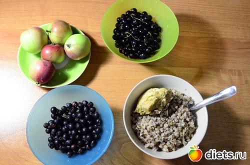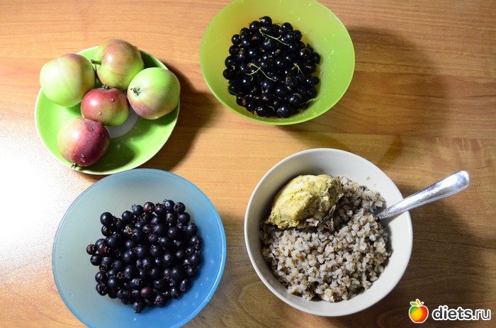 Гречка с кусочком куриной грудки, запечённой в фольге. Несколько маленьких яблочек. Смородина и ирга.