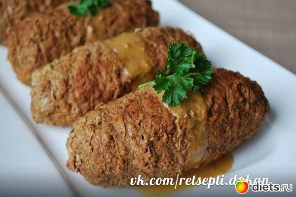 В эту же сковородку выкладываем еще нарезанные шампиньоны и добавляем 2 ложки томатной пасты, немного все это обжариваем и вливаем воду, в соус выкладываем обжаренные рулетики и тушим часа 1,5 до готовности.