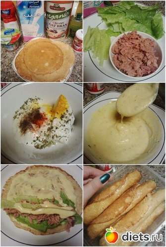 С тунца сливаем жидкость, огурцы режем полосками, салат делим на небольшие кусочки без стволовой части листа. Промазываем каждый блинчик соусом,