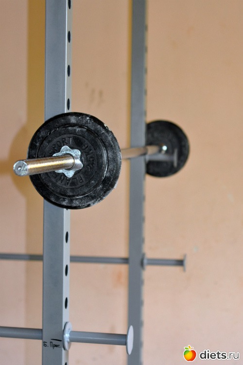 Поэтому прогресс в приседах медленно - со своим весом уже непросто следить за качеством, я внизу ограничители ставлю, вверху держалки, а сама рама высокая - метра два наверн.