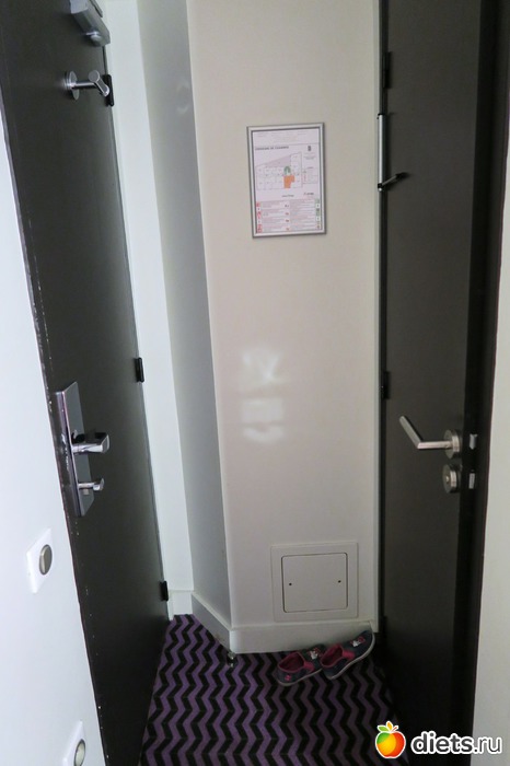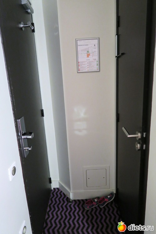Это входная зона. Слева дверь в номер, справа дверь в душевую. Входная дверь открывается не больше чем на 25 градусов из-за, ограничивающего её движение, выступа в стене. Даже ребёнок входил в номер бочком.
