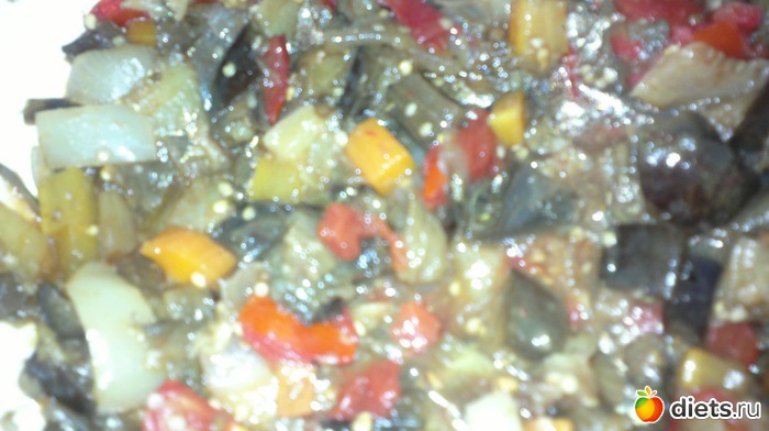 Баклажаны режем кубиками и выкладываем на предварительно разогретую сковороду с маслом. За тем режем лук и отправляем в след за баклажанами на сковороду. Следующая - морковь, потом болгарский перец. Накрываем всё это крышкой и тушим 20 минут. По прошествии 20 минут добавляем в сковороду порезанные кубиками томаты, Перемешиваем после добавления каждого продукта. Солим, перчим по вкусу. Тушим под крышкой минут 10 (смотрим по готовности, чтобы не получилась каша-размазня). Кто любит - можно добавить базилик, укроп, петрушку. Я не добавляла, т. к. на тот момент их не было в наличии. Вообще количество продуктов может быть любым (на вкус). Главное - баклажанов больше.
