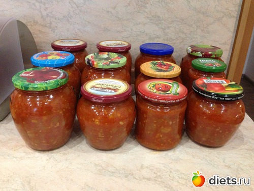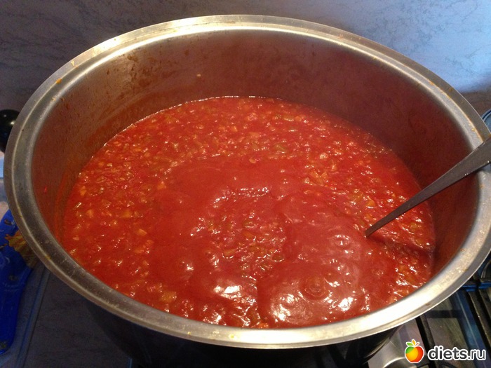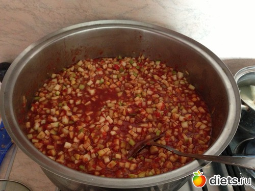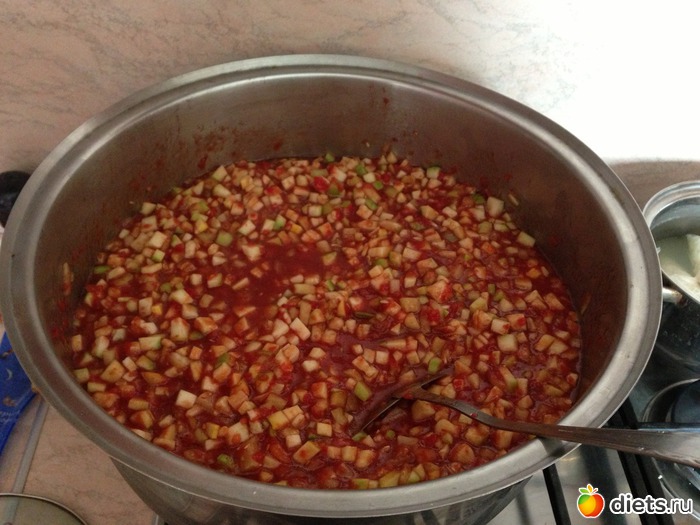 Я сегодня готовила сразу тройную порцию всего этого и выход получился 9 с лишнем литров! Я ещё добавила сегодня жгучий стручковый перец, а красногомолотого положила меньше.