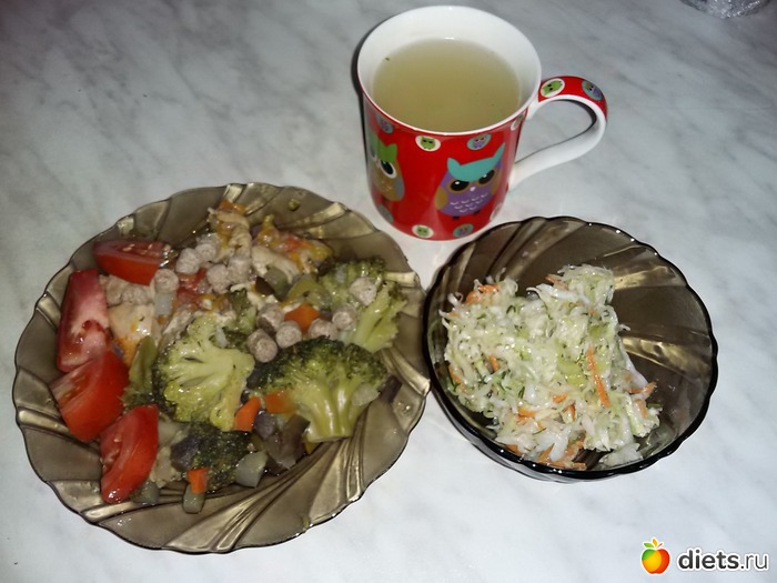 Обед: гуляш из индейки, много разных овощей, немного отрубей сверху и бульон.