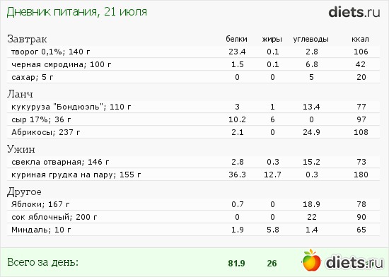 Мой рацион на 21.07 Сегодня пропустила обед. Думаю это не отразится завтра на весах