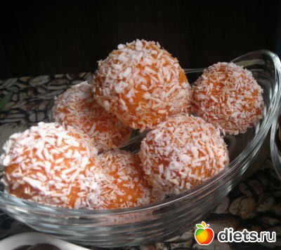 Морковь очистить и натереть на мелкой тёрке. Курагу и ананасы промыть, замочить на час в тёплой воде. В блендере перемешать морковь, курагу и ананас. Взбить всё в однородную массу. Скатать шарики, внутрь спрятав по орешку кешью, и обвалять их в кокосовой стружке. Положить в морозилку для застывания.