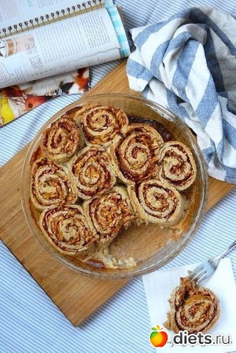 3. Раскатать его в пласт толщиной ок.0,5-1см, позыпать корицей, немного сахаром, разложить натертые яблоки и полить соком с цедрой и завернуть рулетом.