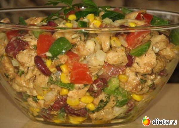 Для соуса смешать уксус, масло, горчицу, жидкий мед, толченый чеснок и тимьян и оставить на 30 минут. В миску выкладываем курицу, кукурузу, красную фасоль, зеленый перец, помидоры, петрушку, лук и заливаем соусом.