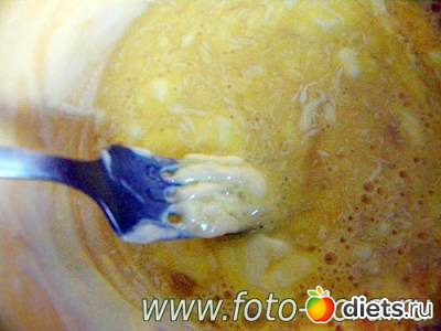 3. Соли массу и потихоньку всыпаем в нее муку, постоянно перемешивая. Тесто должно получиться не крутым, но и не жидким.