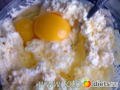 5. Пришел черед начинки: теперь приготовим ее. Если вы используете магазинный творог, то предварительная подготовка ему не нужна. Ну а мы берем творог домашний, поэтому размягчаем его в комбайне, чтобы не было грудок. Затем выкладываем творог в посудину и разбиваем в него три яйца. Все эти ингредиенты замешиваем.