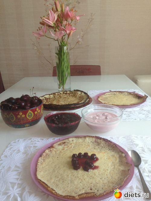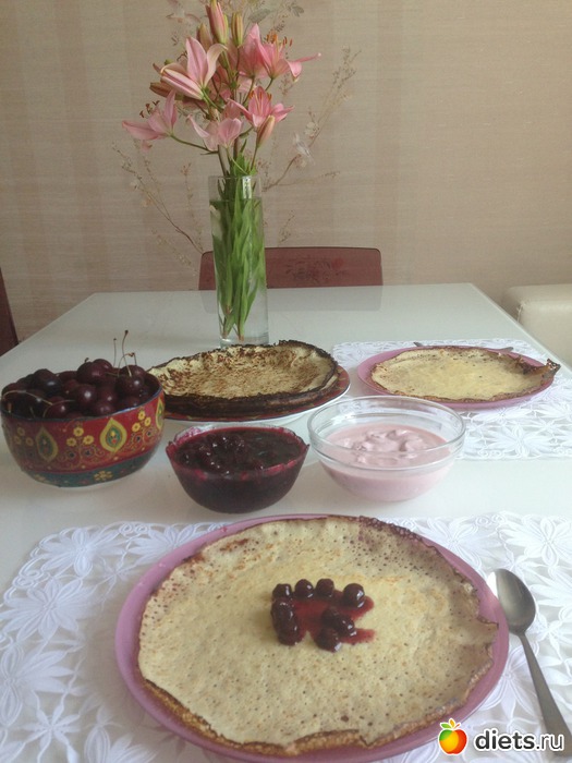 Завтрак, три блинчика, чуток йогурта и вишнёвого варенья!