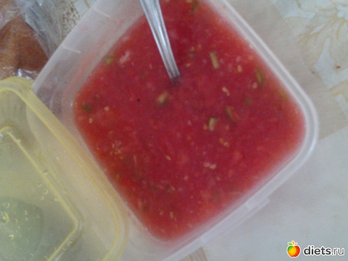 Потом еще сделала а-ля аджику по рецепту начальницы. 3 помидорки через чеснокодавку, туда же 3\4 горького перца, 5-6 зубчиков чеснока, 2 ст. л. пищевого уксуса, 2 ст. л. воды, перец душистый повкусу (у меня смесь перцев). Мужу любителю остренького категорически понравилось.