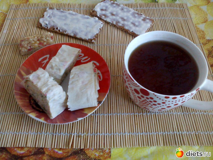 Завтрак - рулет из лаваша с краб. палочками, хлебцы с плавл. сыром, чай. Всего: 187г