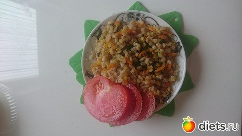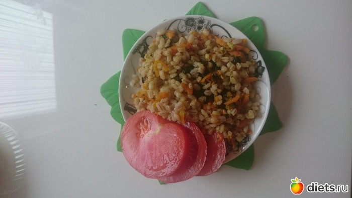 А ещё перловка с зажаркой из моркови, шпината, чеснока и специй +1/2 помидорки.