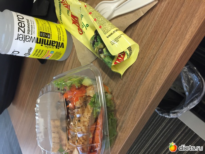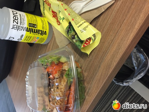 На обед я купила салат в кафе - овощи и грудка гриль, заправила ложкой майонеза