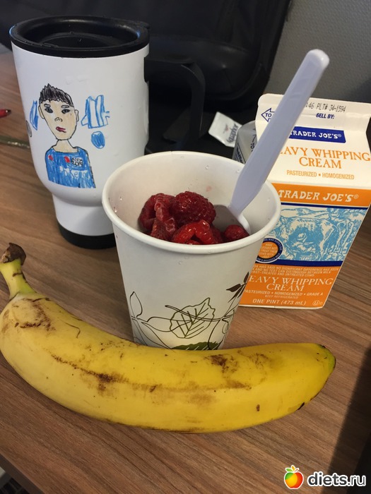 Малина со сливками - чего-то этим летом я с ума схожу от малины. Надо будет ее посадить. И сливки жирные. Десерт! И банан. Он со вчерашнего дня, надо съесть. Энергия нужна