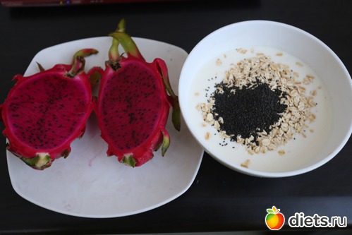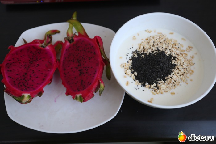 Напекла детям блинов, себе приготовила свой обычный завтрак ( кефир, семена чиа, хлопья, гарам масала и добавила красную питахайю)