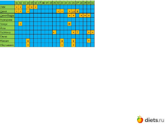 За этот месяц увидела на весах заветные 69кг, но продержалась только два дня, а потом не выдержала такого счастья и свалилась в зажор. В общем-то я почти похудела до прежней одежды. По весу нормально, но корма почему-то шире, чем 5 лет назад при том же весе. Поэтому в конце месяца начала тренировку Джил на бедра и ягодицы.