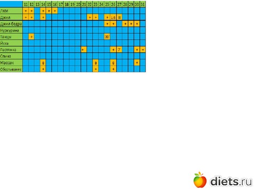 Завела себе табличку в экселе, которая наглядно отображает степень моей активности. В следующем месяце, надеюсь, у меня получится более систематично заниматься собой и таблица будет выглядеть получше. Ну и я вместе с ней