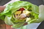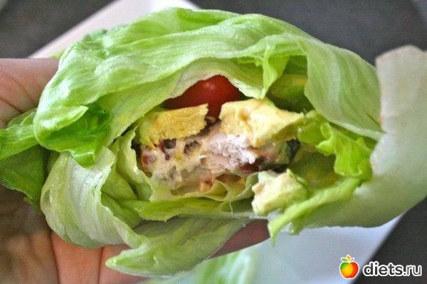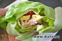 Выложить на листья начинку, полить заправкой, посыпать миндалем. Завернуть.