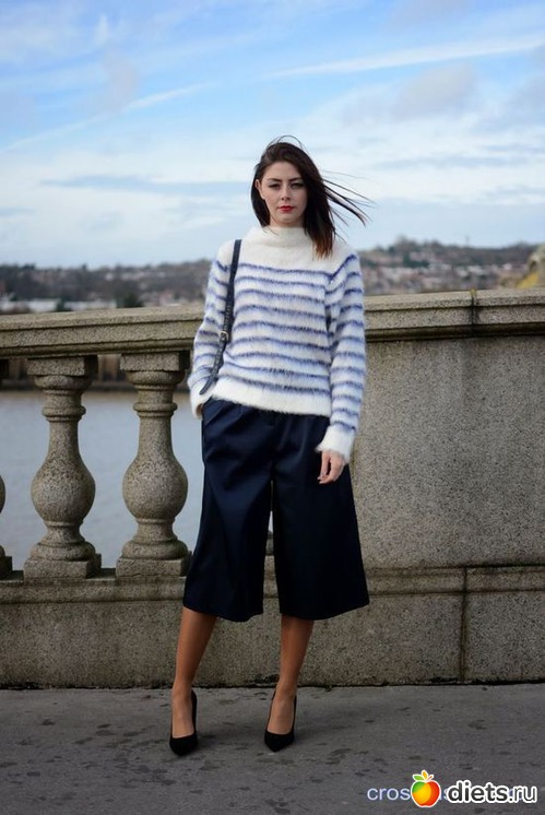 А как насчёт морского образа? Синие, белые или чёрные кюлоты с тельняшкой или любым топом в соответствующем стиле станут незаменимым комплектом как для прогулки по курорту, так и для выходного дня в родном городе.