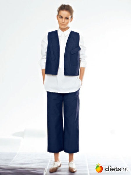 Здесь главное - интересный жилет. Предлагают носить с брюками-кюлотами и рубашкой в мужском стиле. Стиль "гарсон" получается.