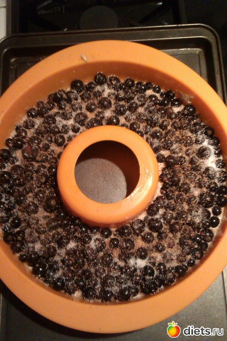 Выкладываем в силиконовую форму с довольно высокими бортами на половину высоты примерно. У меня кольцо диаметром 26 см. Форму кисточкой мажу растительным маслом.