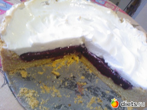 Берем ягоды, или как у меня желе, добавляем муки, что бы оно в духовке не потекло. Выкладываем на тесто и в духовку примерно на 20-30 минут. Затем взбивает белки с сахаром, вытаскиваем наш пирог из духовки, покрываем взбитыми белками и снова в духовку на несколько минут, чтобы белки слегка подрумянились. Нарезать пирог нужно холодным.
