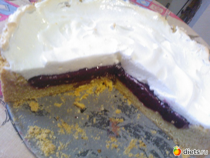 Берем ягоды, или как у меня желе, добавляем муки, что бы оно в духовке не потекло. Выкладываем на тесто и в духовку примерно на 20-30 минут. Затем взбивает белки с сахаром, вытаскиваем наш пирог из духовки, покрываем взбитыми белками и снова в духовку на несколько минут, чтобы белки слегка подрумянились. Нарезать пирог нужно холодным.