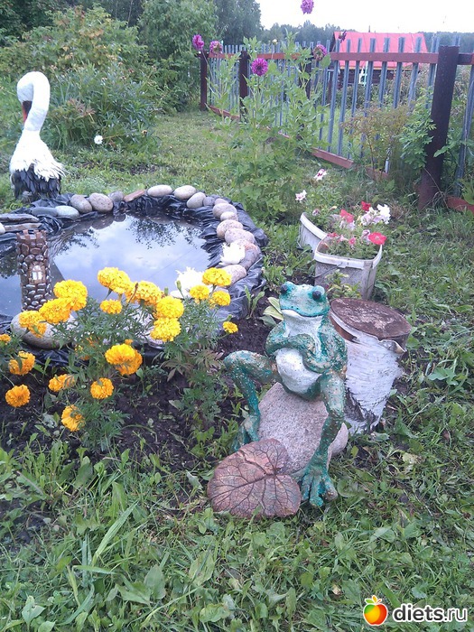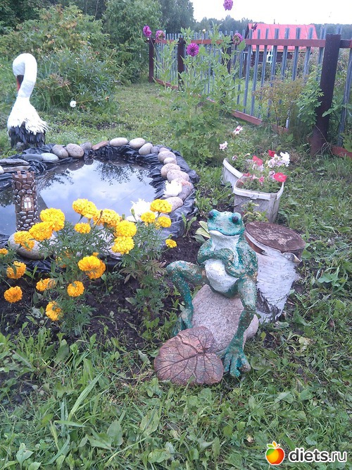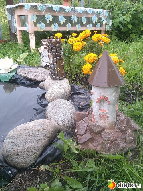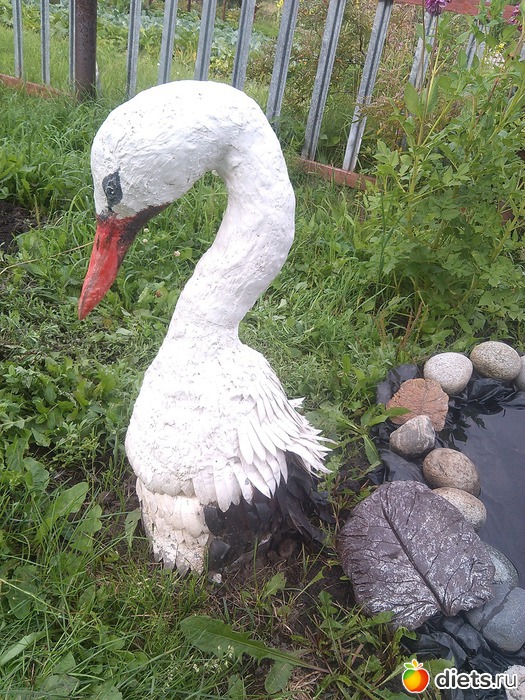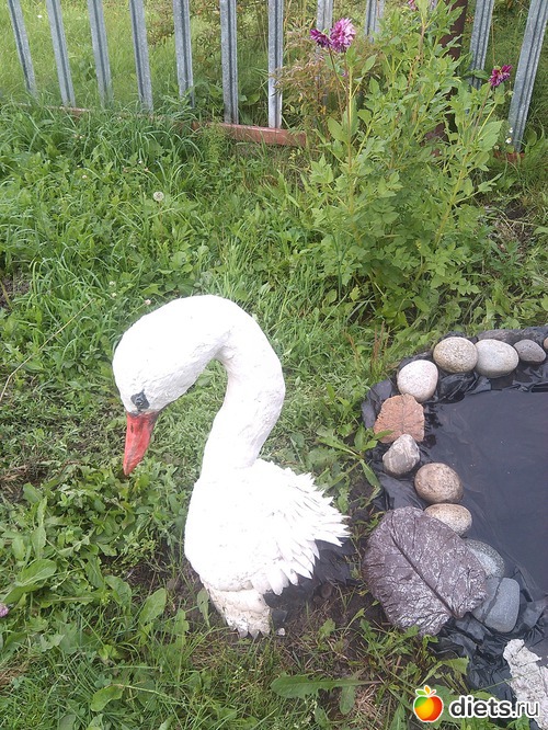 Это моя странная птица, слепленная ещё в прошлом году. Всё пошло не так (первый опыт работы с гипсом) и птичка получилась непонятной породы... На следующее лето, учитывая багаж приобретённого опыта, планирую смастерить двух полноценных лебедей